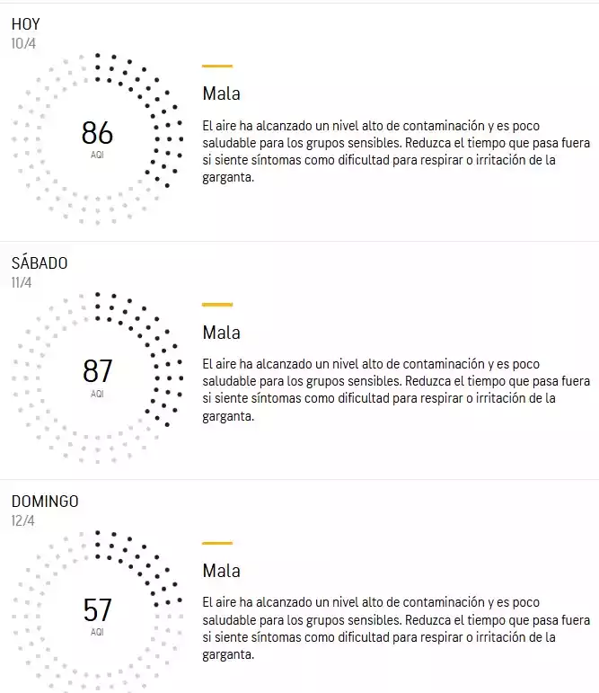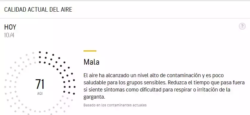 Alto nivel de contaminación en el aire y es poco saludable para los grupos sensibles.
